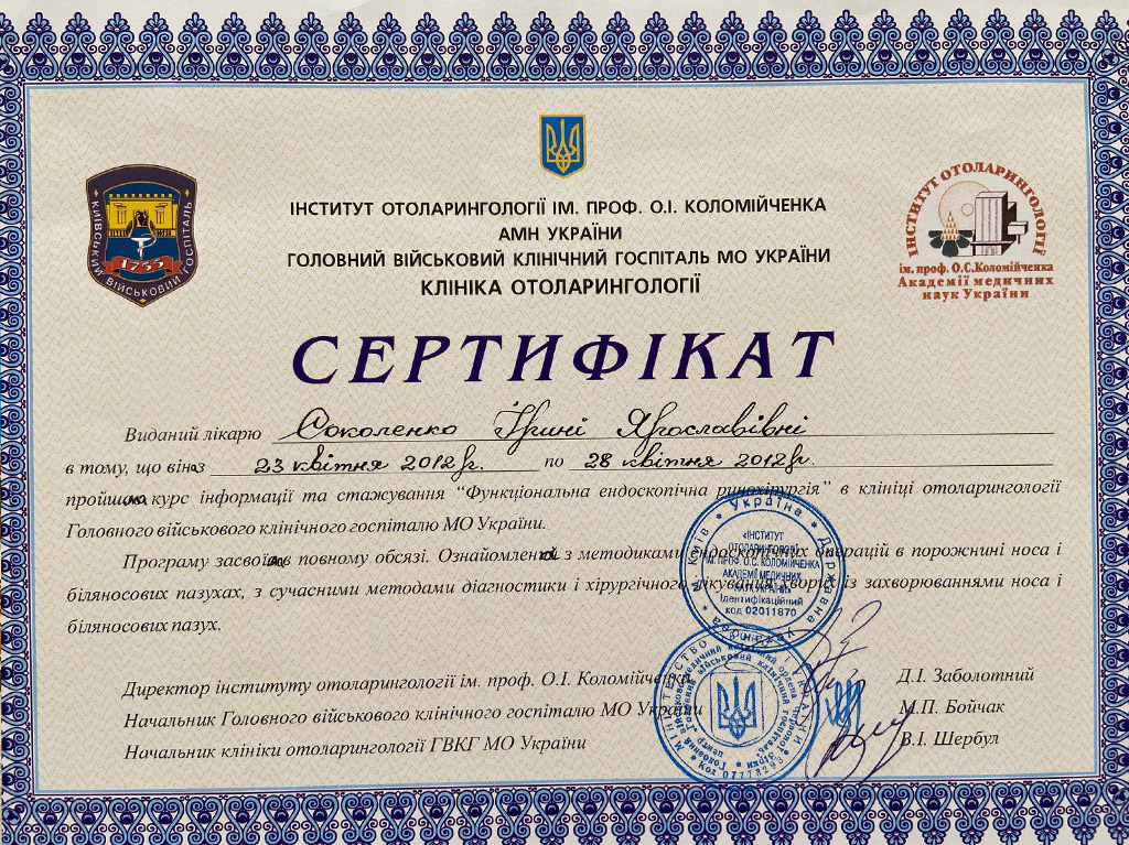 З 2007 до 2009р.р. інтернатура за спеціальністю оториноларингологія